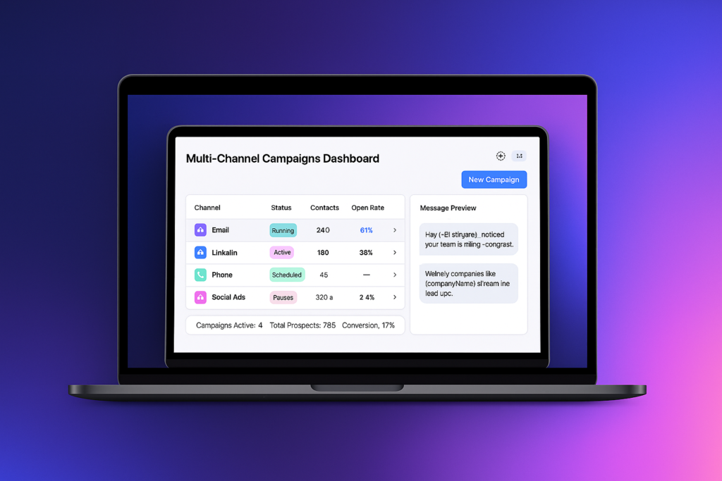 Reach your audience where they are. With EpsimoAI, launch fully synchronized campaigns across email, LinkedIn, phone, and social media — all from one platform. Personalize every touchpoint and maintain consistent messaging to turn multi-channel engagement into real pipeline growth.